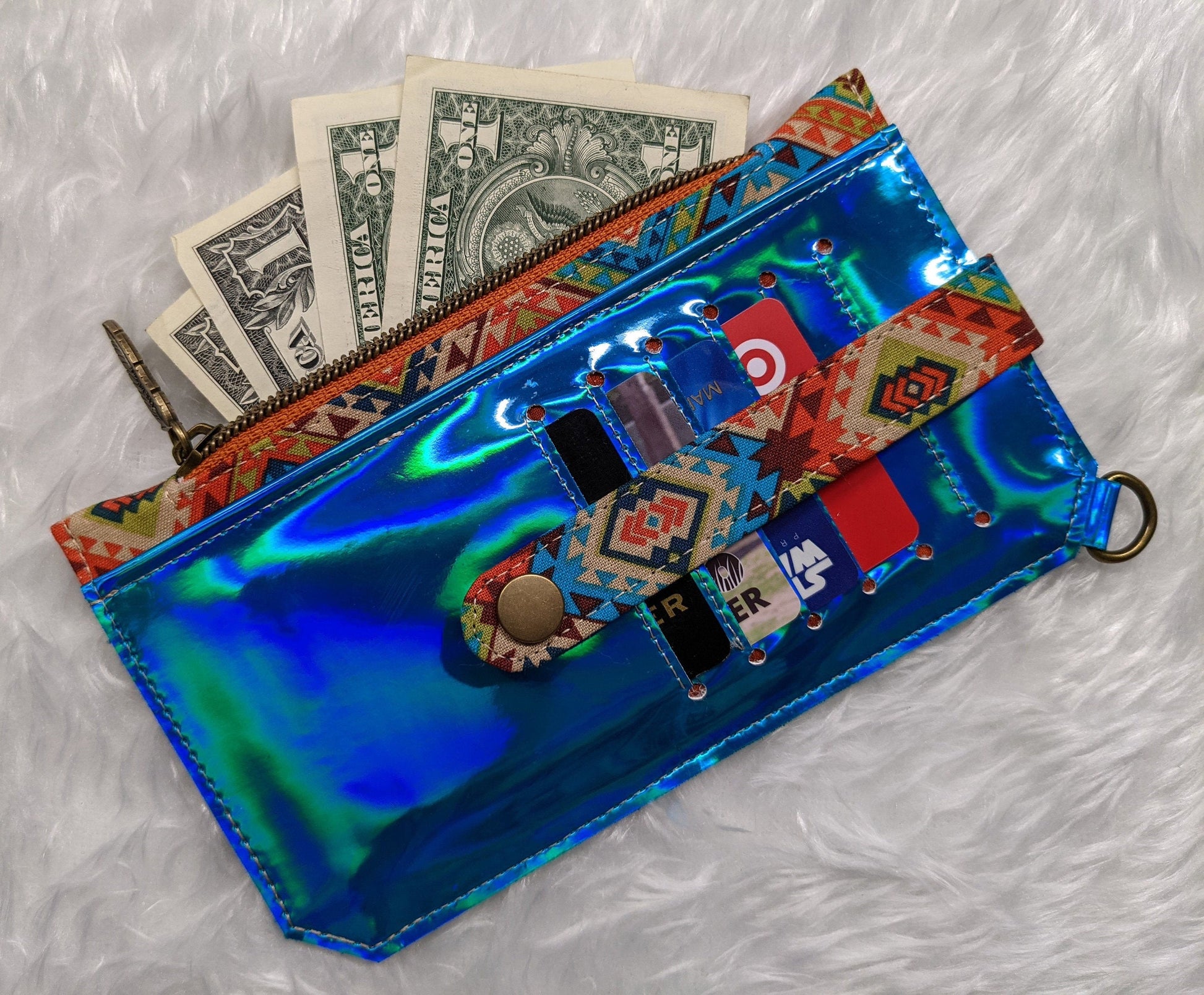 - slim vinyl and fabric wallet fits everything you need and makes swapping purses a snap